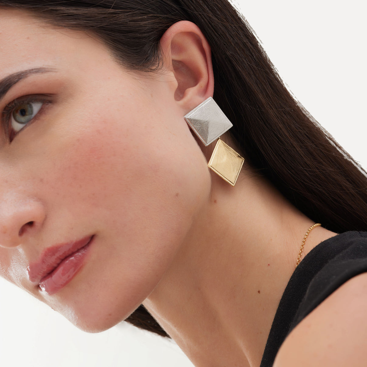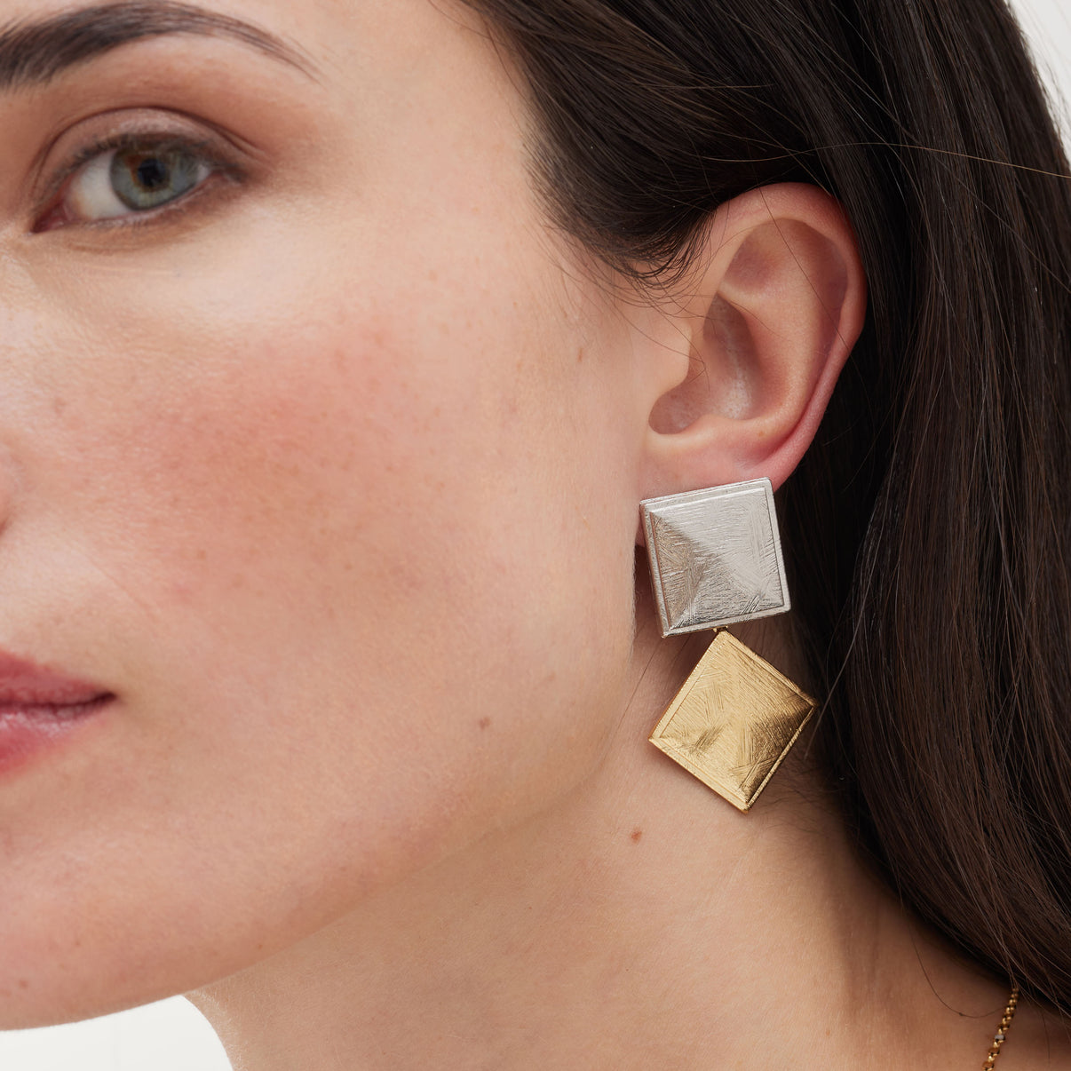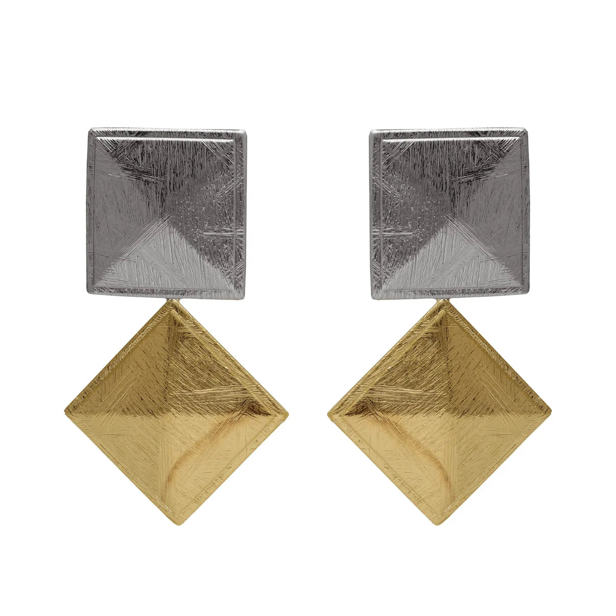 Orecchini corti e argento sterling placcati in oro 18kt e rodio. Dimensioni del motivo di 4,8 cm x 2,8 cm a forma di quadrato con chiusura a scatto della collezione Good Mornin