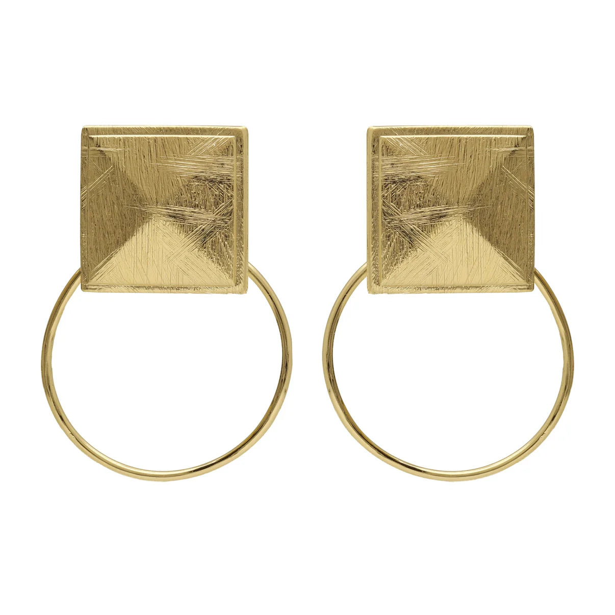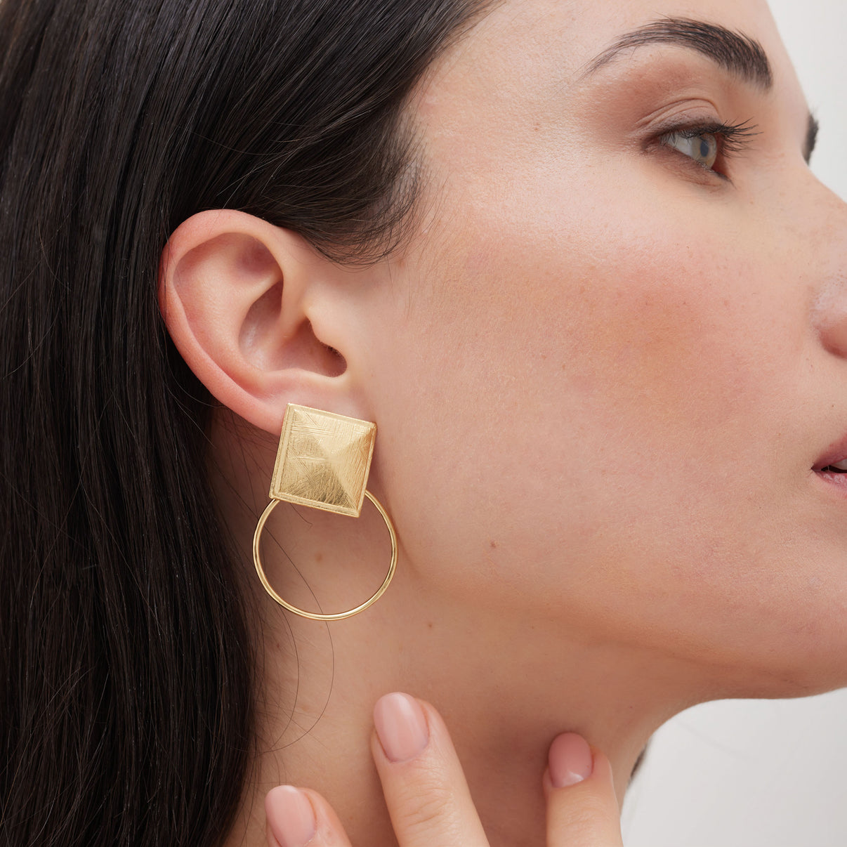Orecchini corti e argento sterling placcati in oro 18kt. Dimensioni del motivo di 4,2 cm x 3,1 cm a forma di quadrato, diametro di: 3,1 cm con chiusura a scatto della collezione Good Morning